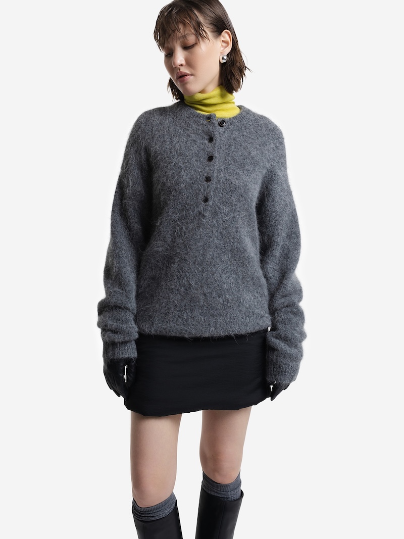 Юбка мини дутая, черныйДжемпер из альпаки на пуговицах, серыйВодолазка из шерсти мериноса, лимонный