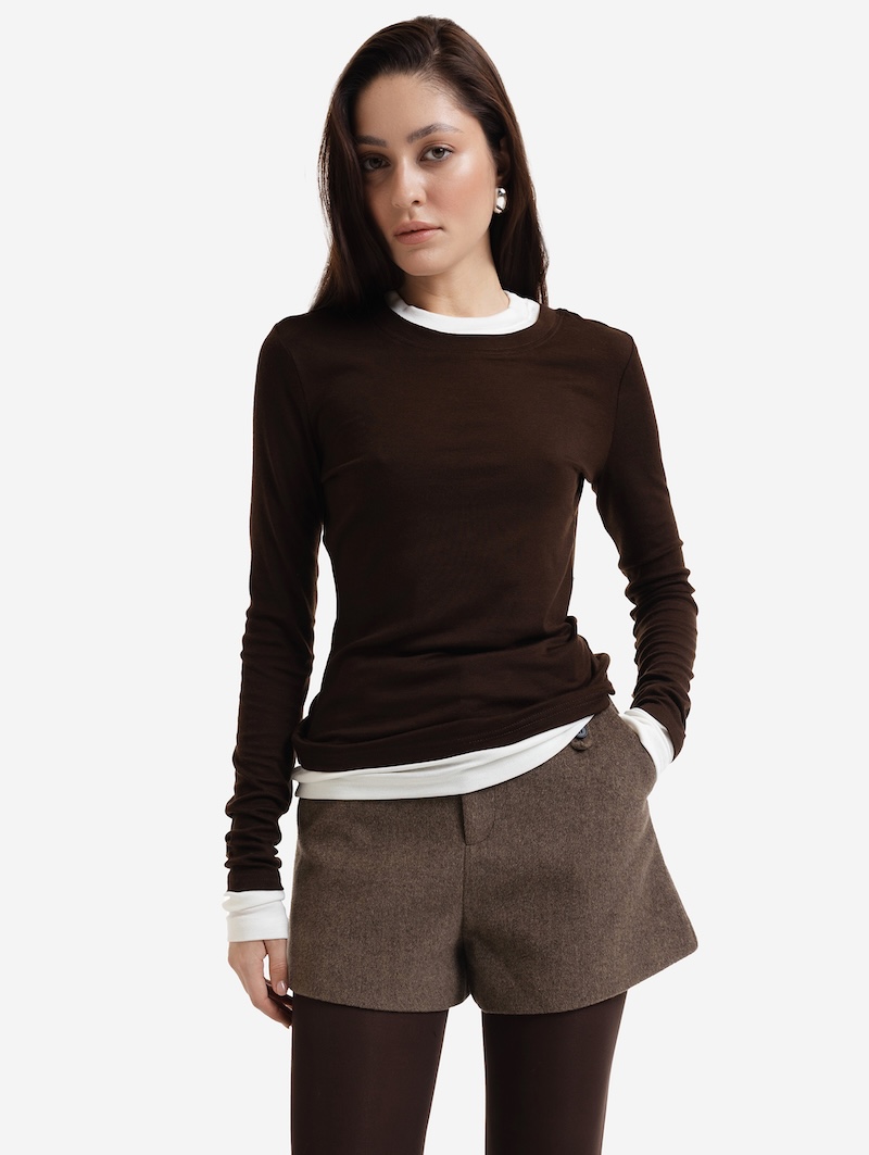 Шорты, коричневыйЛонгслив двойной из тонкого трикотажа, белый-коричневый